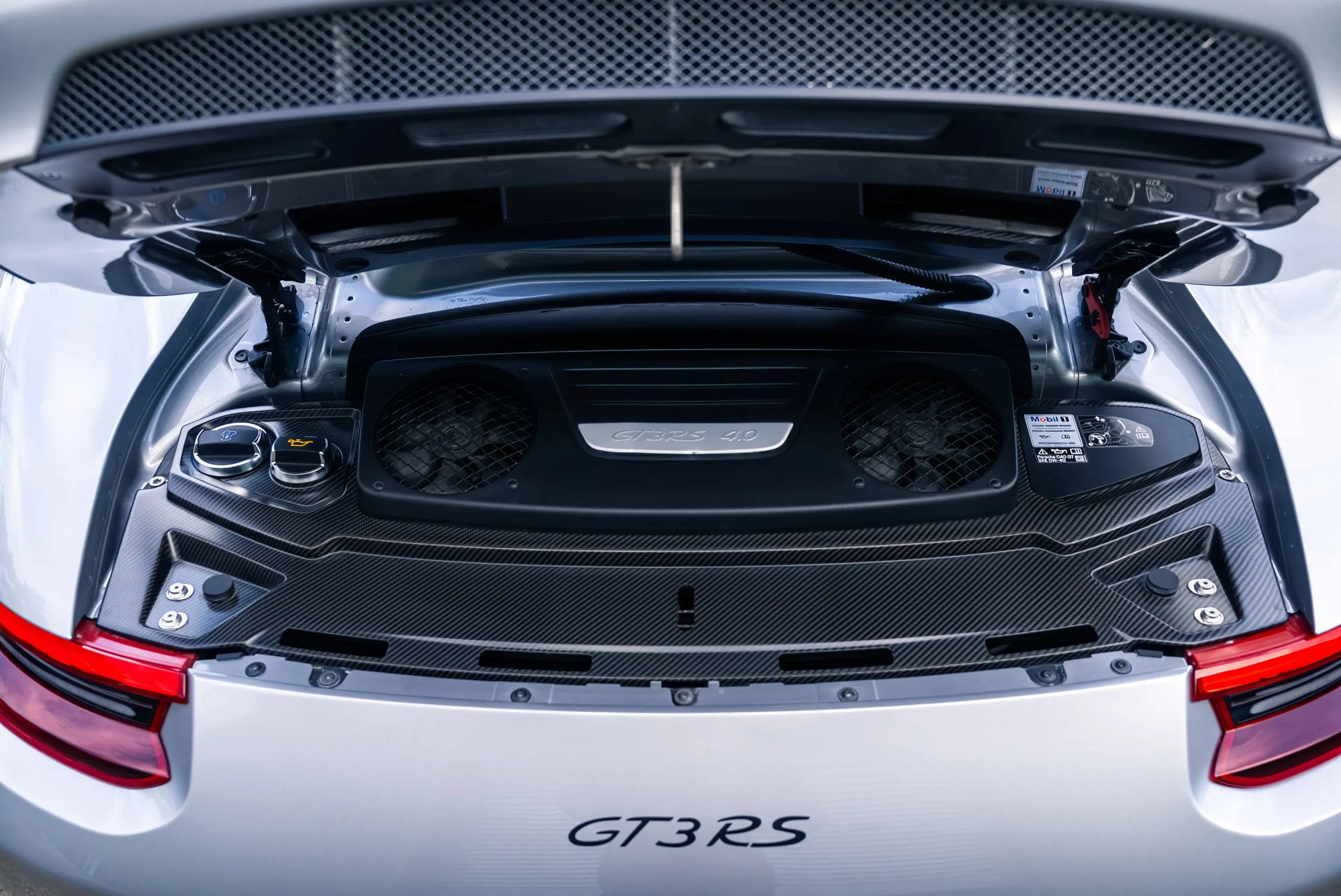 The 991. 2 marked a significant technical evolution over the earlier 991. 1 GT3 RS, featuring revised cylinder heads, solid tappets, individual throttle bodies, and reworked engine management, resulting in sharper throttle response and a more urgent top-end character. Further aerodynamic refinement and increased cooling capacity accompanied these mechanical updates.